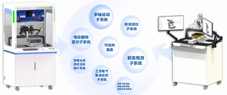 具备在常规平⾯基底及曲⾯基底表⾯进⾏按需点喷、连续直写和雾化制膜等多种喷印模式的功能